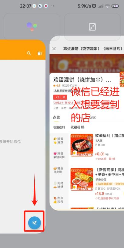 6. 接下来,去微信,打开某团/某饿的h5链接找到你要复制的店铺并进入点单页再打开httpcanary,点击右下角蓝色小飞机开启抓包