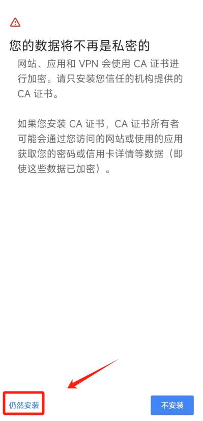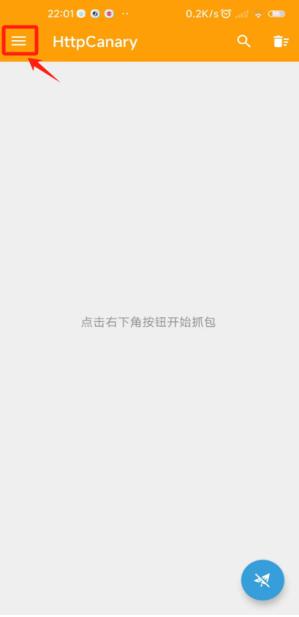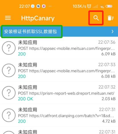 8停留在httpcanary内,点击右上角搜察图标[显示蓝色条内的东西,因为是去授权版会有这个提示不要管他!!切记不要点,点了就重复安装ca证书了! !!]