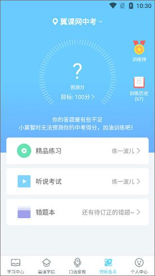 在【智能备考】界面,平台会根据你的学习情况进行分数预测,让用户可以了解自身的不足同时还提供了精品联系、听说考试、错题本,帮助你快速提高英语分数;