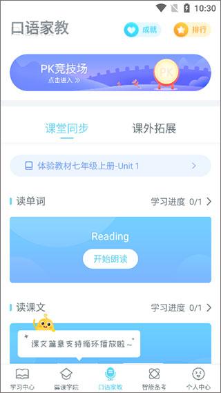 在【口语家教】界面,有PK竞技场,你可以和其他用户进行在线PK。同时还有读单词、读课文等功能,快速提高你的口语能力;
