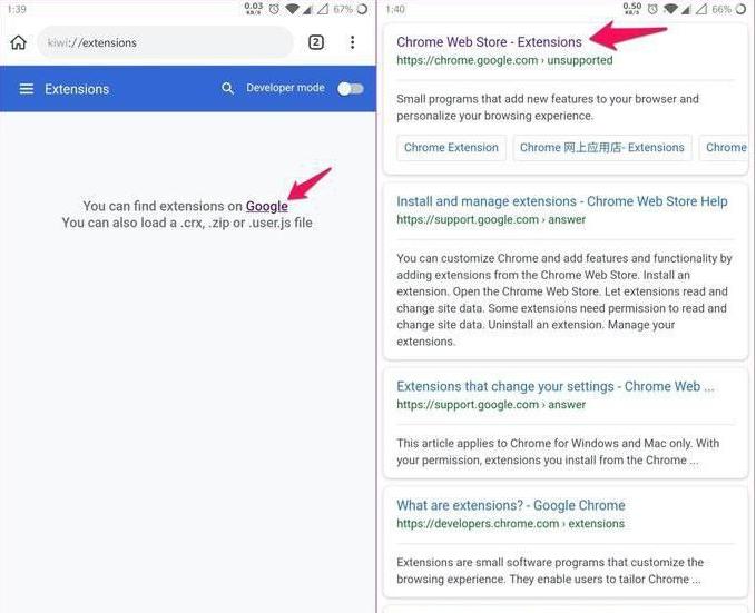 第2步:在“扩展程序”页面中点击Google超链接,然后从下一页中选择Chrome Web Store结果。