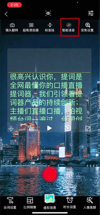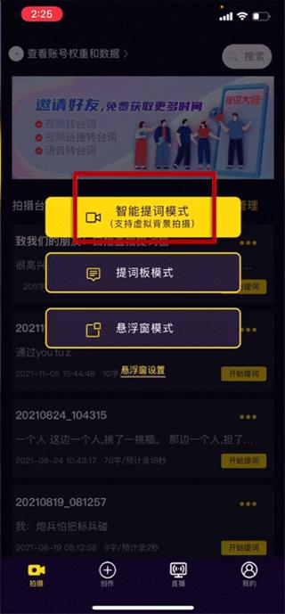 2、在【拍摄】页面然后找到一个台词,我们点击开始提词,选择第一个智能提词模式;