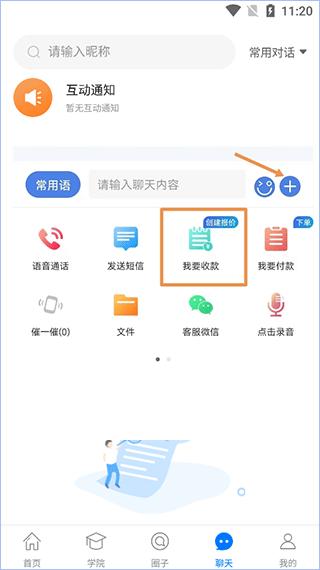 3、点击聊天框右侧"+”,点击[我要收款][创建报价]