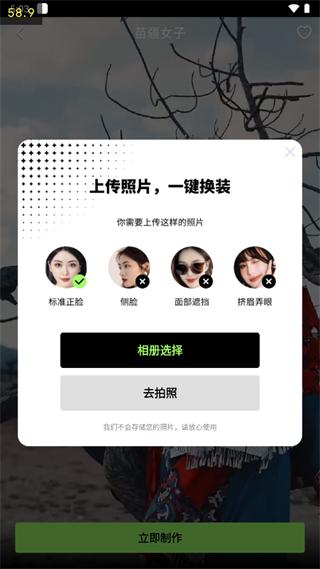 4、点击立即制作,拍照或上传你的标准正脸,稍等片刻查看到制作效果;