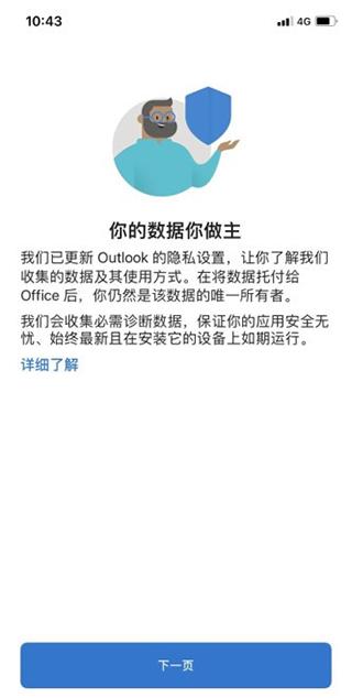 登陆帐户后,Microsoft 365版outlook会进行一系列数据隐私等提示,单击下一页完成阅读即可。