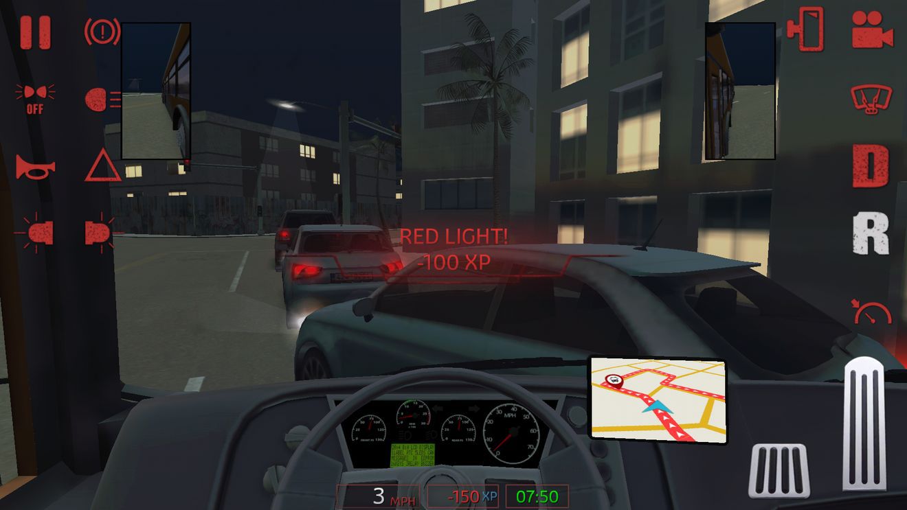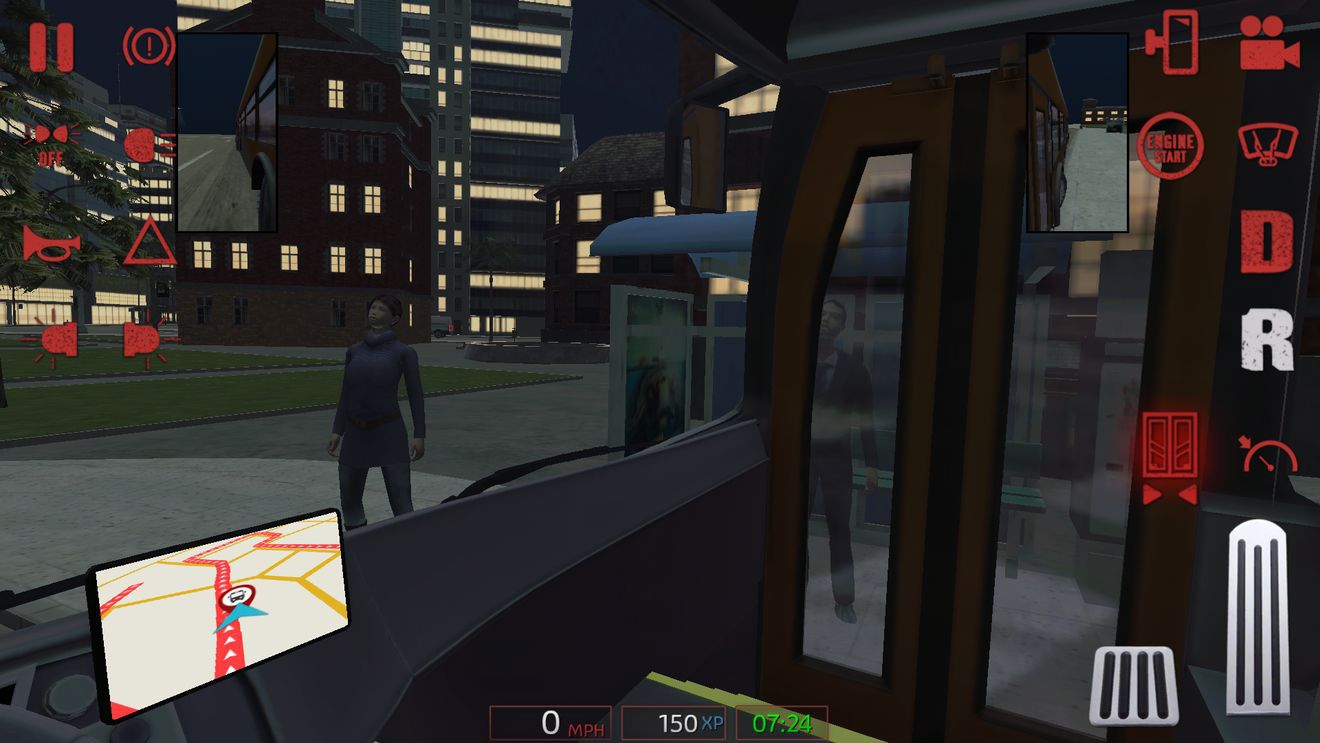 游戏有多种操控模式,可以选择自动或手动挡。新玩家当然建议从自动挡开始体验。驾驶舱内的导航系统会清晰地告诉你路线。看到路边红色区域便是车站,到站后会自动出现开/关车门的按钮,以便接送乘客。