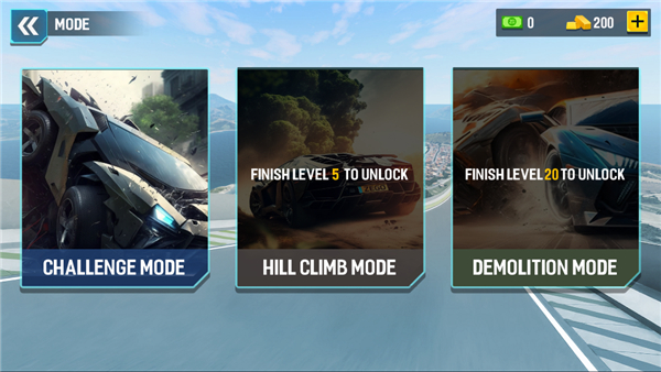 不仅如此,超级车祸模拟器最新版当中还提供CHALLENGE MODE(挑战模式)、HILL CLIMB MODE(爬山模式)、DEMOLITION MODE(拆除方式)3种模式,以及几十种不同的关卡场景供玩家们挑战,对此有感兴趣的小伙伴可以来下载体验~