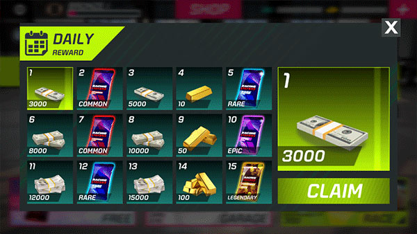 2、选择好后,就能够看到底部的各种赛事了,左上角还可以领取每日奖励,准备好酒店及【RACE】开始第一场较量吧。