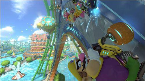 在赛道设计上,任天堂为我们展现了系列中最强的集合,在六个杯赛中汇集了16条新赛道与16条“复古”赛道。新的每一条赛道都不缺少各种有趣概念,流畅感,以及精心的设计。在第二个杯赛的后半段,更多天马行空的点子与挑战不断冒出——从飞机上发射出发后落到雪山冲下斜坡,在壮观的云层之上竞速;库巴的新城堡中的赛道难度极高,新的彩虹之路趣味性十足——然而,他们无法掩盖复古赛道的光芒。