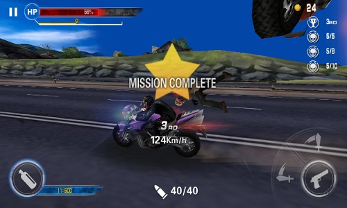 既然是暴力摩托那游戏中一定少不了暴力摩托中经典的玩法——踹死对手…和PC上的暴力摩托不同,本作在游戏中加入了武器系统,玩家们想要使用武器则需要自己购买,而不能像原版的暴力摩托那样直接从对手身上抢过来。特别夸张的是,游戏中的攻击几乎都是一击必杀,只要你打到对手,就会直接出现KO的慢镜头效果!超带感有没有?