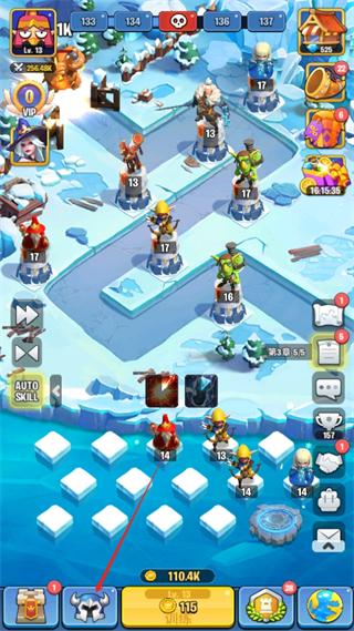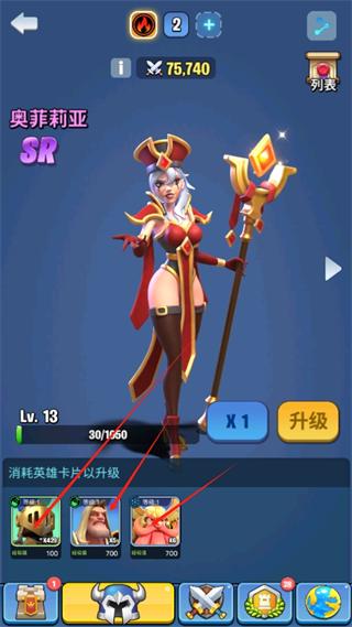 2、进入英雄界面,英雄是非常强力的角色,比士兵的输出能力大好几倍,所以培养英雄们是非常重要的,点击升级;