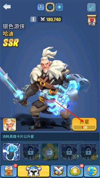 3、进入英雄升级页面,点击如图所示,花费英雄卡进行升级;