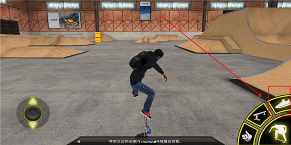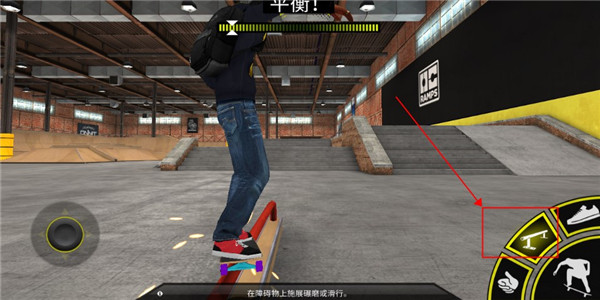 3、这个则是碾磨按键,主要栏杆等地形按住此键可以进行滑行,将此键和方向键组合使用,可以施展不同的平衡动作