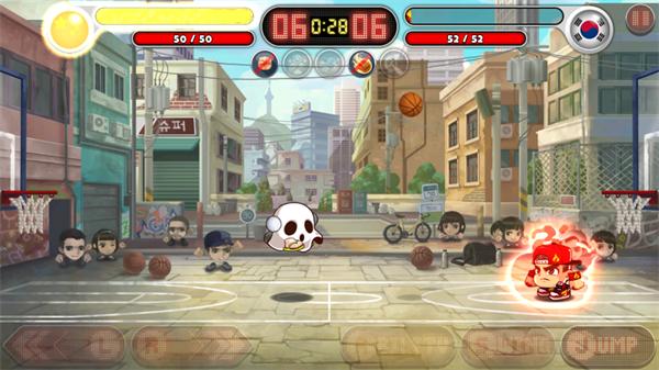 1、用头去碰撞篮球进行对战游戏的操作比较简单,玩家们点击屏幕左下角的按钮可以控制左右移动,右下角则有跳跃、攻击按钮可以控制比赛过程。篮球运动本身就比较复杂,本作只是将它进行精简而已,操作上也是如此,并没有类似“NBA2K”系列那么复杂的人物走位与动作技巧的控制,仅仅通过简单的移动和碰撞来对抗,技术性上要弱了许多,好在比赛过程的对抗性以及精彩效果并没有降低太多。
