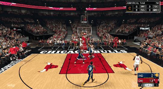 如果跳起的瞬间,发现对方亦腾空,你还可以有挽救这个进球的机会,那就是空中改变投篮,在扣篮或上篮过程中,在空中向任何方向推动右摇杆。那么可以将上篮变为假投或者是一个大风车换手上篮。