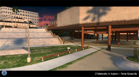 游戏采用了全3D引擎制作,我们将在城市专用的滑板区域进行体验。本作在画面上的表现非常不错,有些类似《侠盗猎车手》这样模拟真实的城市规模,不管是在建筑物、场景地图、人物造型上都以模拟真实为主。游戏中都市繁华依旧,光影之下建筑物层次感分明,色彩上的紧密搭配,特别是人物的肢体动作方面,通过滑板来完成各种极限动作表演,角色的身体也会表现出应有的动作姿势,给玩家们带来恍若真实的运动视觉体验。