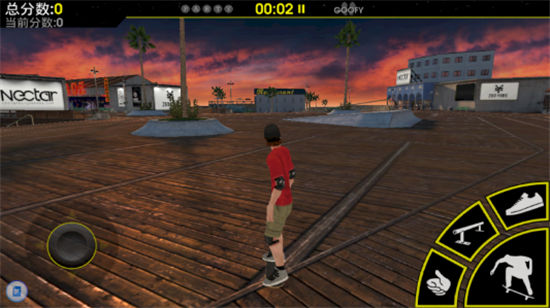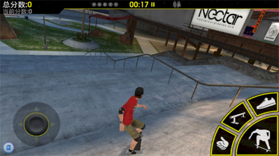 游戏中玩家们手指按住屏幕左下角的摇杆可以控制角色移动,屏幕右下角则有各种极限动作按钮,点击之后我们的主角就可以做出这些花式动作,如果在配合上本身场地就有的各种斜坡、钢管等地形,就会表现出各种极限动作表现。游戏的操作采用了摇杆与按钮控制的方式,这种操作方式在很多RPG游戏中比较常见,而本作这样类似自由轮滑的过程却有些令人意外,控制起来倒也简单方便,小编最开始以为是滑动屏幕使用手指动作来完成各种花式表演的,不过这种按钮的方式会更轻松一些。