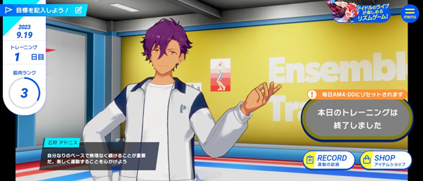 获得的奖章可用于商店解锁其他角色作为运动时的讲师,以及购买更多的 BGM,而游戏内也预告满 10 天将会有特别奖励,鼓励玩家每天来做运动。