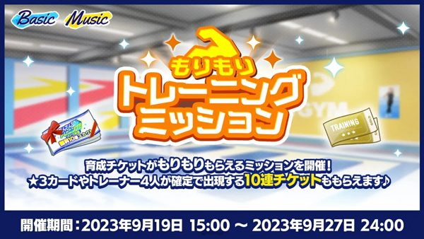 2023 年 9 月 19 日~9 月 27 日,将举办可获得育成券等奖励的期间限定任务,当中还可获得 ★3 卡片或确定获得教练 4 人的 10 连转蛋券。