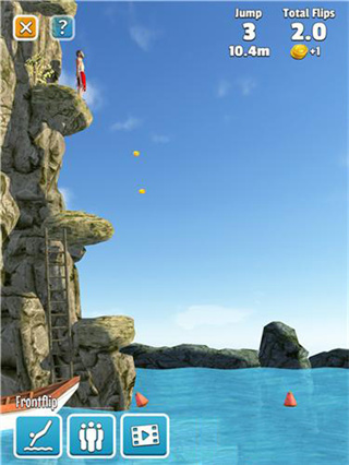 在游戏中,玩家只需要控制角色离开跳台,然后点击屏幕让其用各种姿势入水即可。当然如果想要拿到高分,还是需要角色的头部或脚部笔直入水才算达标。