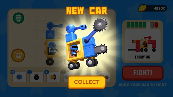 1、游戏中通过组装解锁不同的车辆来和敌人战斗,获胜即可获得金币购买更多零件。