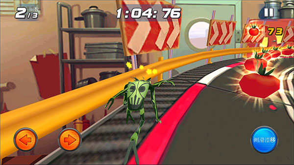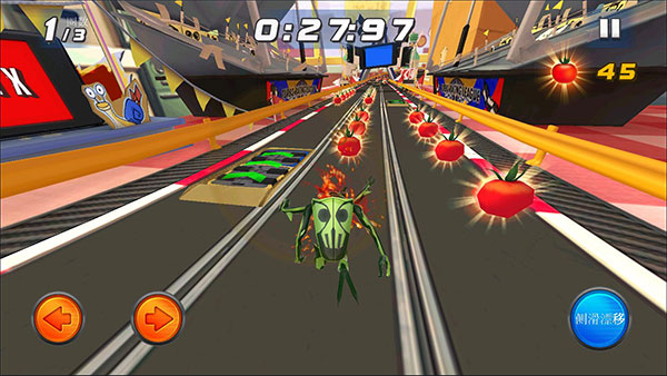 1、十三个独特的比赛跑道去测试你的技能。2、挑战模式: 与好友们 单挑,并赢得美味的番茄。