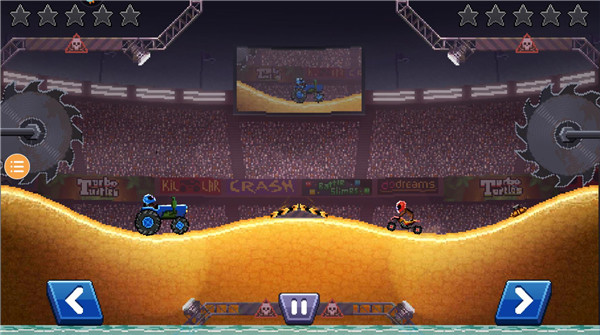 撞头赛车旧版本是一款像素风格的休闲赛车游戏,在游戏中玩家要驾驶各种载具与对手对抗,不管你是直接用赛车撞击对方还是用场地的机关道具攻击对方,只要系统判定一方的头部受伤,游戏就分出胜负了,玩法虽然看上去虽然简单粗暴,但是却充满了乐趣和挑战。一方面,游戏中,有数百种不同的载具可供选择,从普通的汽车、摩托车、自行车等,到奇特的坦克、飞碟、恐龙等,每种载具都有自己独特的外形和性能,玩家可以通过完成任务或者使用金币和螺丝来解锁更多的载具,同时游戏还提供了各种头盔和服装来装扮自己的角色,增加了游戏的趣味性。