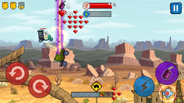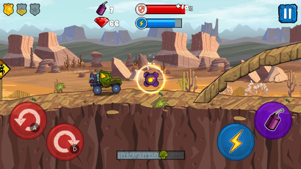 1、【玩法】针对于游戏的玩法来说,其实还是比较简单的,左侧主要控制着赛车的重心,右侧以加速和炸弹释放为主,期间关卡中还有许许多多的障碍和路道设计,让每一关都尽显特色。