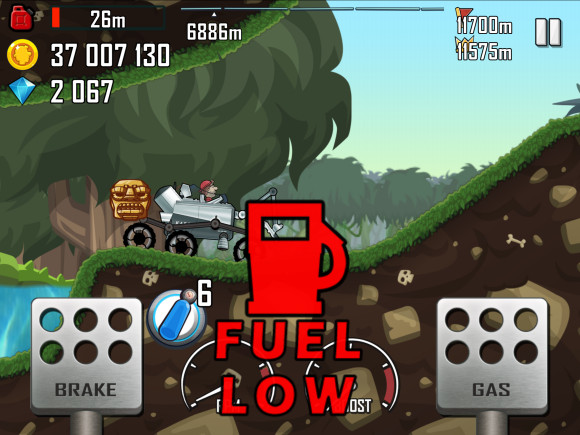 刹车和油门除了能控制前进和后退之外,还能让你在空中保持平衡,幅度过大非常容易翻车,且你必须要赶在燃油耗尽前到达终点。