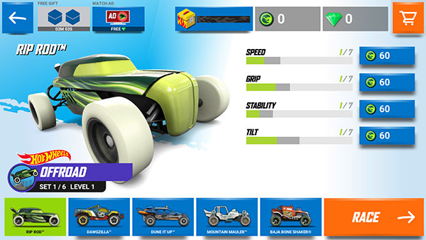 3、该界面显示了我们将要驾驶的赛车,点击下方的赛车图片即可切换,也可以在右边进行升级,准备好之后,点击右下角的【RACE】按钮。