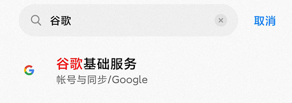 1、首先我们打开手机的系统设置,输入【谷歌】/【Google】等关键词进行搜索,找到【谷歌基础服务】一项,并进入。