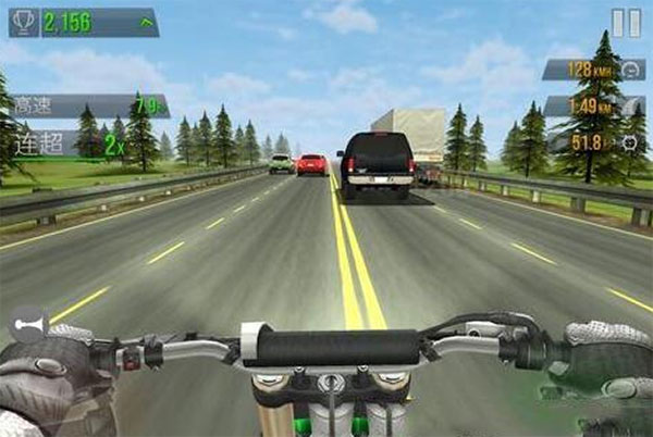 1、玩家在游戏中以第一人称驾驶摩托车在公路上驰骋,同时辅以重力感应控制,玩家只需通过晃动手机来实现摩托车的转向。在游戏的左下角和右下角分别有一个刹车键和加速键,玩家只需根据自己情况选择按哪一个按键。不过,小编建议经常按加速键你会很快的通关。