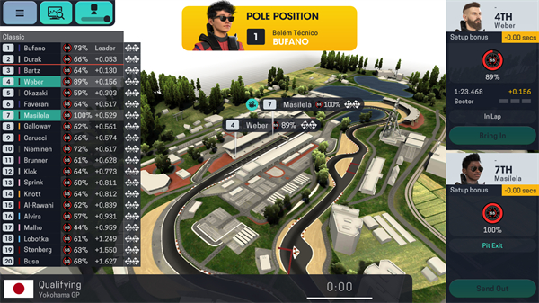排位赛有时间限制,一般来说能跑个两三次,在这期间,玩家要做的事给车手设定好合适的轮胎与驾驶风格,让车手能跑出自己的最好成绩,并把这个调整好的设定带入正赛。