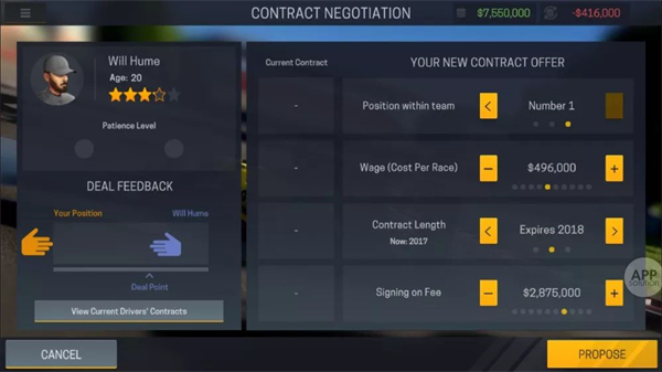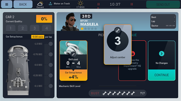 车手是另一个非常重要的变量,并且可经营度不亚于车辆。玩家作为经理,要能根据车手的期望提供双方认可的合约。签下之后,车手的表现也会为他自己挣下技能点升级,一共六项指标,都是越高越好。