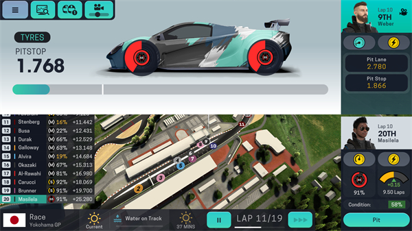 正赛不仅比的是车手的水平,车的水平,经理的组织安排也非常重要。在一场比赛中,玩家必须要计划好两部车进站换胎的时机、更换的胎型等等。一场计划得好的比赛,才是一场发挥出真正水平的比赛。