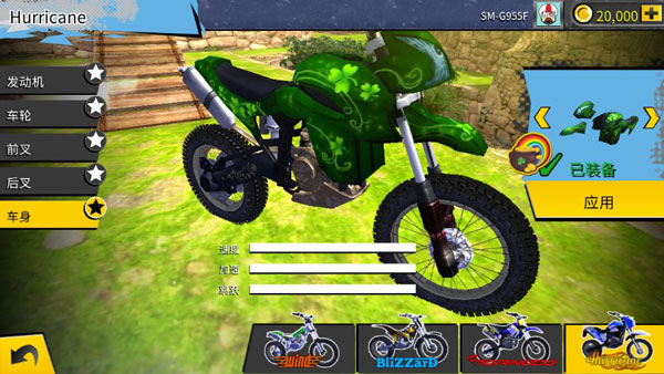5、通过游戏关卡中的获胜奖励,你可以在主界面下,选择改装你的摩托动力,增加摩托车的平衡动力和输出威力,这对于玩家赢取比赛起到十分重要的作用。