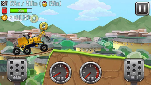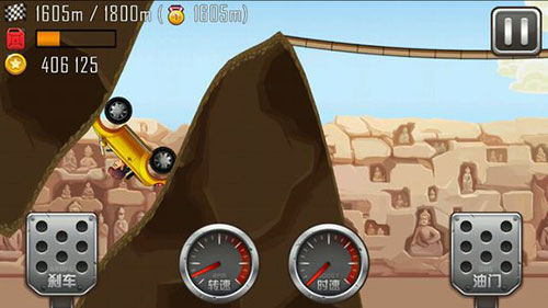 游戏操作非常简单,简单到根本无需新手教程,在屏幕下方的左右两侧分别有刹车和油门按键,我们通过点击游戏来加速,而刹车则是在下坡路段速度控制不住时派上用场,从而来保持小车的平衡,那么到底何时该加油门何时该该点刹车,其中掌控的度还需大家自己琢磨掌控。