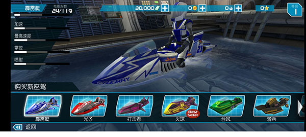 1、今夏最搞笑的摩托艇水上竞速游戏,在不同的蓝色摩托艇赛道上竞技。