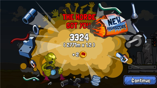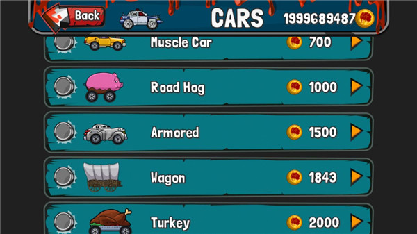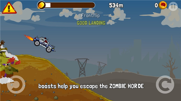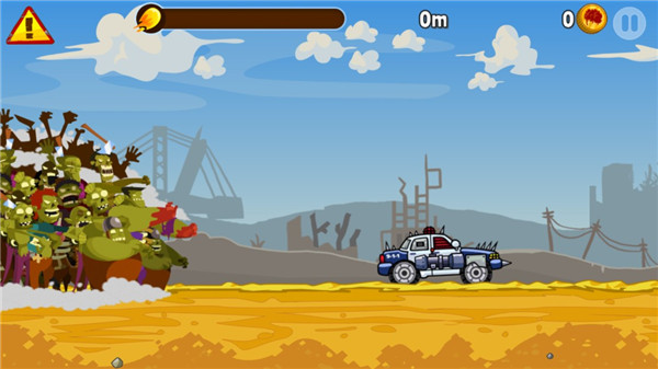 提高汽车性能就可以使速度有所保证,但一辆车只能升级2次;玩家也可以到商店购买豪车,土豪的速度必定有保证。在游戏中,你不仅要保持自己车子的平衡,找准下落的角度,还要使用车上的重型武器击碎这些僵尸。要是单纯的撞上去你的车子就会被减速,那就很容易失败了。每过一段路会出现一个加油站,车子经过这里的时候,僵尸会自己开始后退。当你在不停的击杀僵尸时,屏幕上方的能量条会增加,当蓄满力时,我们就可以如同疯狗一样疯狂向前冲。