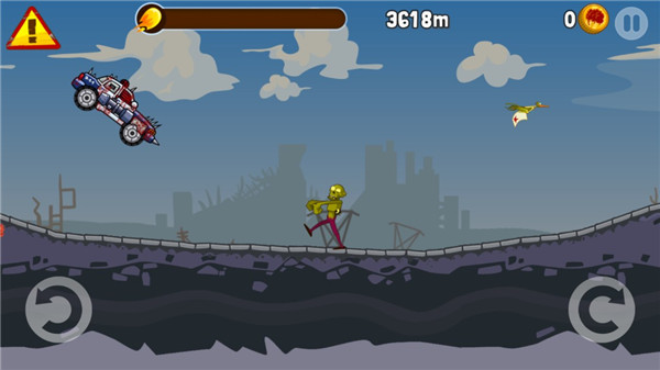 游戏操作较为简单,玩家点击屏幕即可射击前方的僵尸,车撞到前方的僵尸会减速。当然,操作如果仅此而已未免显得有些枯燥。游戏过程中,玩家可以在屏幕底部看见两个按键。点击左右两个功能按键来控制汽车平衡,汽车翻身落地后游戏失败。在游戏过程中发现一个小技巧,不管是爆头击杀僵尸、压碎僵尸还是使用特技翻转汽车后完美落地后还可以得到加速效果。