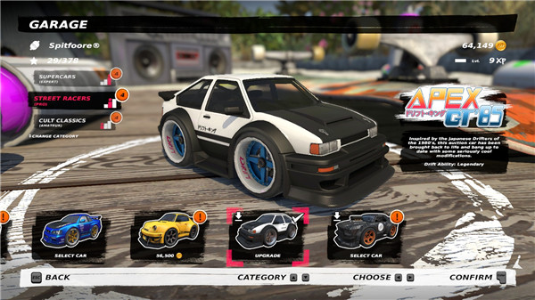 举个例子:下面是我的AE86——咳咳我指的是Apex GT85,它的漂移能力排名在传奇级(传奇是为Apex做的特定等级,是游戏中最好的)。