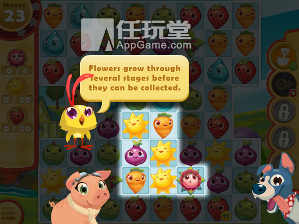 游戏的另一个难点,就是会三段变身的小花。它们无法移动,这就意味着不能和别的果菜交换位置,是一个障碍——它初始形态是花蕾,当邻近的一组果菜被消除时,它稍稍打开花瓣;再消除一组,它才完全开花;又消除一组,才把它也一并消除掉(小A:消除小花是既定任务,不能放着不管)。