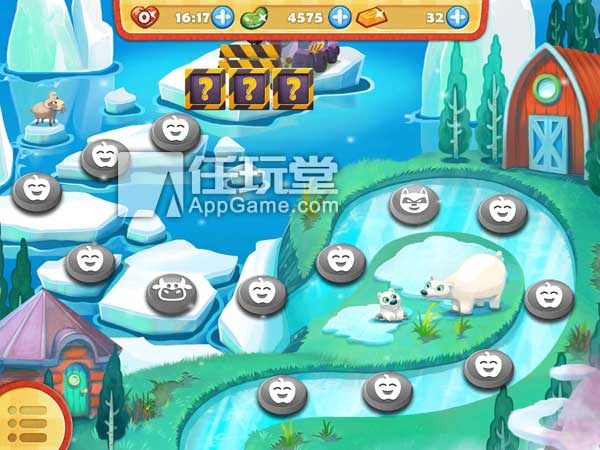 Farm Heroes Saga之所以看上去“很简单”,原因之一就是水彩风的场景和粗线条的作画,怎么看,怎么童真兼低龄化。这里要留意一下:地图上有几种标签,其中有奶牛标签的关卡代表玩家完成游戏将获得动物的奖励,有干脆面君(小浣熊)标签的则代表玩家在游戏中要抢在浣熊之前消除果菜。