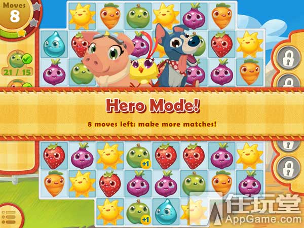 目标果菜收集完毕,但步数还有剩的话,游戏会进入限时的“英雄模式”,目标果菜哗啦啦地出现,赶紧利用上面提到的连消战略消除它们,这是拿高分的好机会!值得一提,“英雄模式”被定位为打高分的爆发阶段,加成奖励不断叠加,自然而然,剩余步数越多,斩获好成绩的机会自然越高!