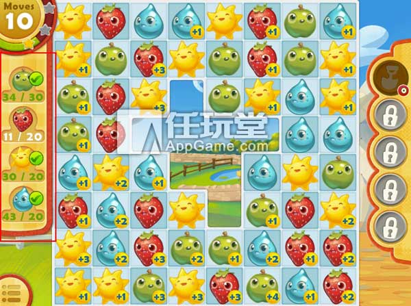 游戏每关都有特定的任务,这是它的一大玩点,每关都会要求消除一定数量的果菜,玩家在游戏中就不会漫无目的地东一下西一下;这是它的一大难点,因为步数有限,玩家必须看着消除的数量和步数来玩,不要光顾着消除一种目标果菜(别以为失败了可以无限“重来”,游戏有生命限制,5点消耗完,要么花钱买,要么等上三十分钟重新获得1点)。