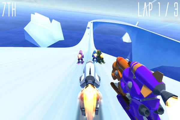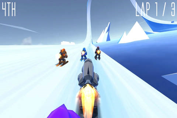 玩家在游戏中要使用滑板在冰面上滑行,并借助背后的火箭推力器为自己加速。玩家可以借助左右倾斜设备和触摸来控制角色移动,玩家要在游戏中熟悉比赛路线,并巧妙地避开障碍物来增加自己的速度。