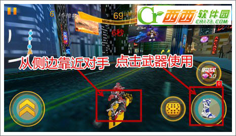 敢跑在我们前面?简直吃了豹子胆,不用犹豫,开到对手侧边,点击武器即可将他踢下车,第一名肯定是我们的!
