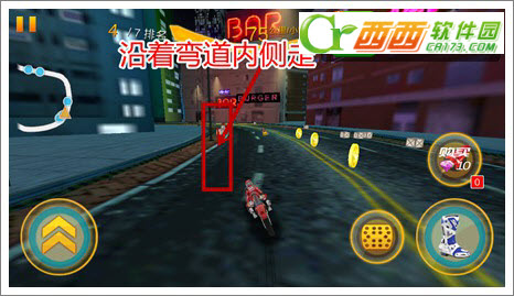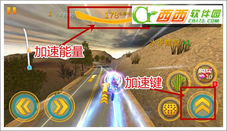 游戏开始前可以购买加速道具,或者游戏中拾取氮气瓶可以积攒能量,点击右下角使用能量为摩托车加速,可以快速超过前方的对手。