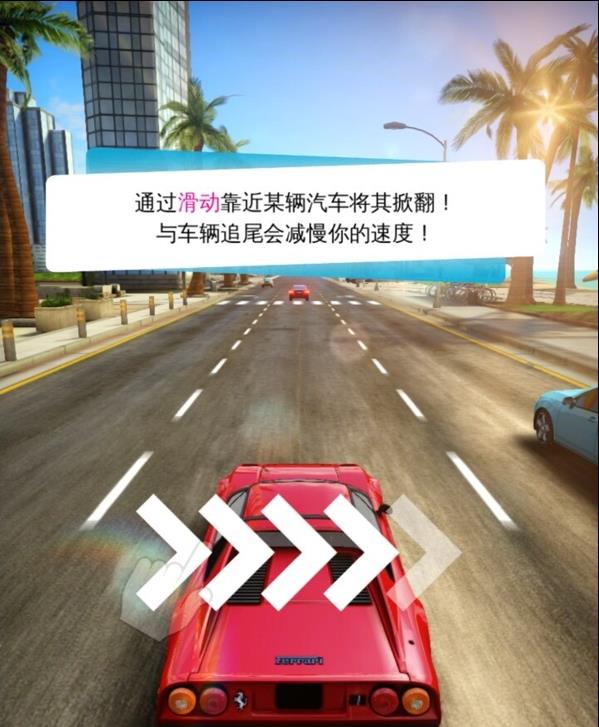 赛道中为了避免和其余车辆追尾而减慢自身的速度,我们可以在靠近汽车时将其掀翻,向左或向右滑动就可以了。