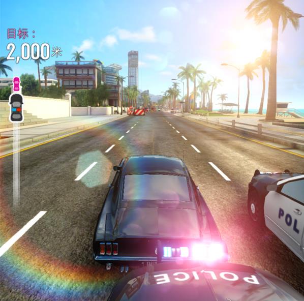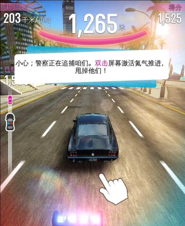 在关卡道路上我们可以使用双击屏幕来激活氮气推进,快速的甩开警车的追捕。氮气可以在关卡赛道中收集,小编建议玩家上放的氮气条满时在点击使用氮气,这样效果会更加显著。
